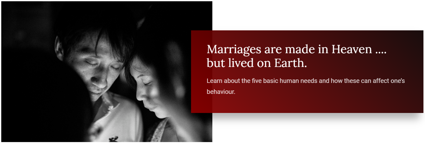 Even happily married couples get depressed, fight, lose jobs, struggle with financial difficulties, go through crises, deal with sexual and other addiction problems. CEP will introduce the Choice Theory which advocates that “the only person whose behaviour we can control is our own”. Find out how to focus on improving your marriage instead of trying to change your spouse. Learn the “nine psychological tasks” that a couple must undertake in order to develop a positive and intimate marital relationship. Learn how to achieve work-life harmony in traditional and companionate marriages.