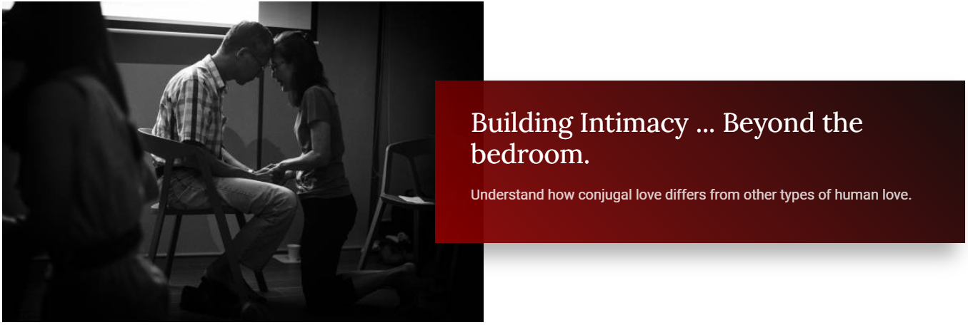 Learn the importance of building intimacy as a couple in everyday living; marital intimacy is not confined to isolated experiences of romanticism during occasional dates or holidays. It is the sharing of “the deep me” with “the deep you” in the daily lives of a couple. Marital love grows as the Husband and Wife move from the “I” to the “We”; slowing down for the other and learning to make decisions based on what's best for “us”; instead of what's best for “me”. The spouses progress to the “I Thou” relationship when they start to live for the other. God is the Third Partner who helps the husband and wife to direct/channel their eros love into life giving agape love.